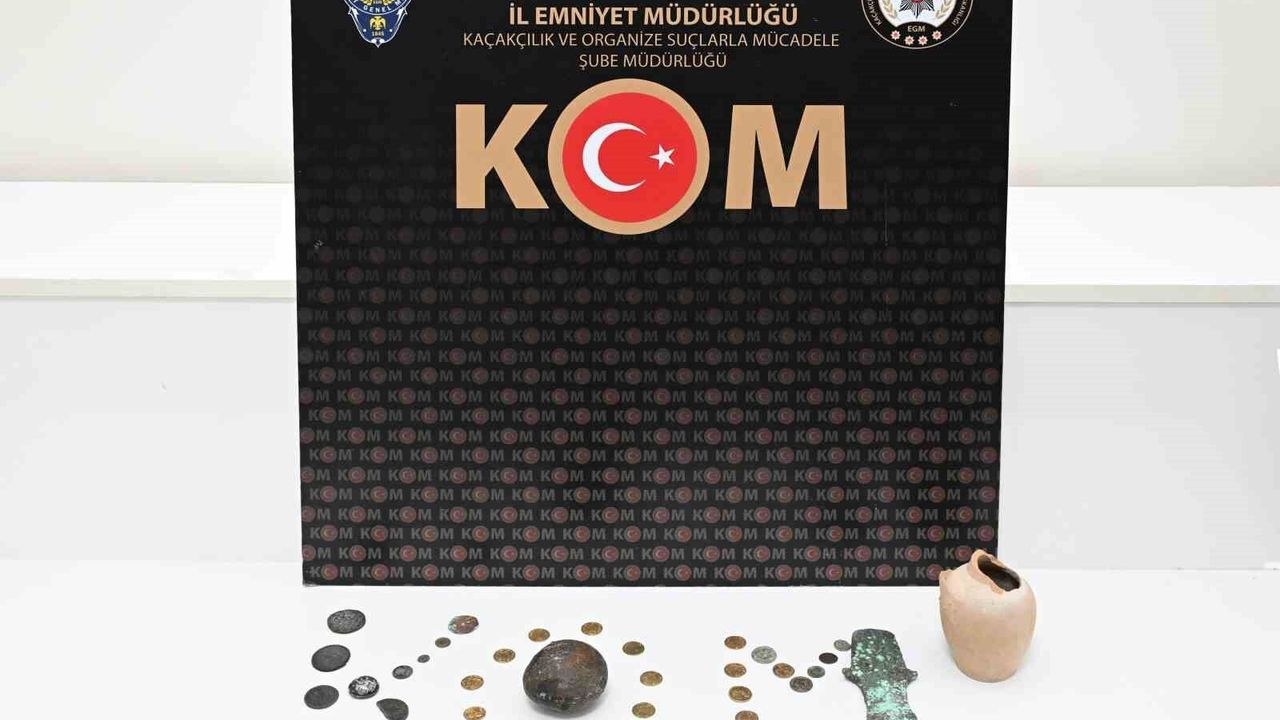 Edinilen bilgiye göre, tarihi eser niteliğinde objeleri bulundurduğu ve satışa sunmaya çalıştığı tespit edilen O.G.'nin ikametinde arama yapıldı. Yapılan aramada; 19 Helenistik, Roma ve Doğu Roma dönemlerine ait olduğu değerlendirilen altın sikke, 16 Arkaik (Antik Yunan) döneme ait sikke ile 3 Selçuklu dönemi obje olmak üzere toplam 38 parça tarihi eser ele geçirildi.