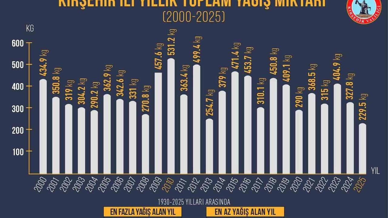 Çevre, Şehircilik ve İklim Değişikliği Bakanlığı Meteoroloji Genel Müdürlüğü tarafından Kırşehir'in 1930 yılından günümüze uzanan yağış kayıtları incelendi. Yapılan analizlere göre 2025 yılı, 229,5 milimetre yağış miktarı ile 1930'dan bu yana en az yağış alan ikinci yıl olarak kayıtlara geçti. Kentte tüm zamanların en kurak yılı ise 202,3 milimetre yağış ile 1932 yılı oldu. Açıklanan verilere göre, 2026 yılına yağış açısından olumlu bir başlangıç yapıldığı belirtilirken, 30 Mart 2026 tarihi itibarıyla kent genelinde 198,6 milimetre yağış kaydedildiği ifade edildi. Bu miktarın, 2025 yılının toplam yağışına yakın seviyede olduğu vurgulandı.