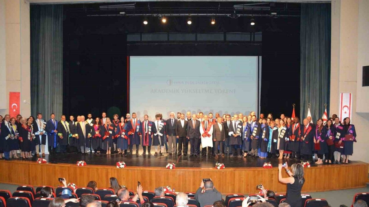 2024-2025 Akademik Yılı Akademik Yükseltme Töreni, Cumhurbaşkanı Ersin Tatar’ın katılımıyla Atatürk Kültür ve Kongre Merkezi’nde gerçekleştirdi. Saygı duruşu ve İstiklal Marşı’nın ardından başlayan tören, Müzik Öğretmenliği Bölümü öğrencilerinin sunduğu müzik dinletisi ile devam etti. Ardından yapay zekâ tabanlı akademisyen Ai. Prof. DUX’ın günün anlamına ilişkin konuşması yayımlandı. Törende, 64’ü yardımcı doçent, 24’ü doçent ve 19’u profesör olmak üzere 100’ün üzerinde akademisyen atama belgelerini aldı.