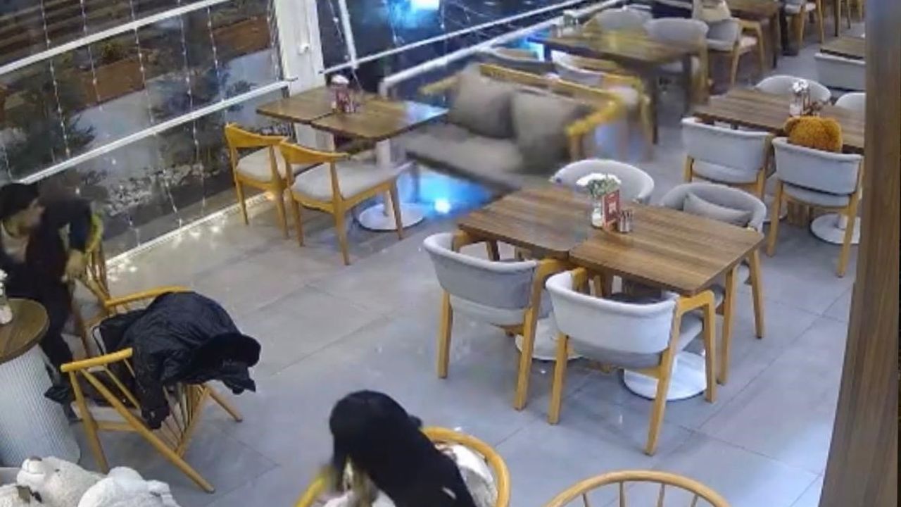 Öte yandan, otomobil kafeteryaya girmeden saniyeler önce 2 kişinin aracın girdiği bölümdeki masaya oturmak üzere olduğu ve kazayı saniyelerle atlattıkları anlar güvenlik kamerasına yansıdı.