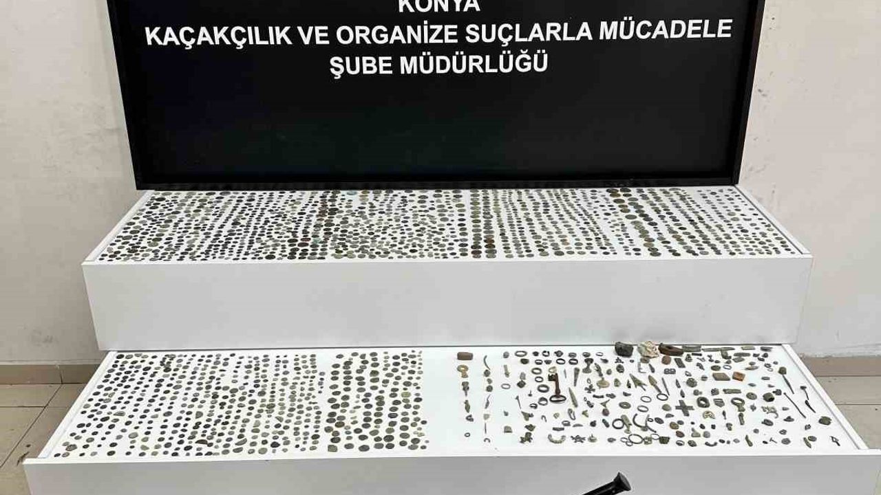 Konya’da düzenlenen operasyonda bin 912 sikke ve 196 tarihi eser niteliğinde obje ele geçirildi.