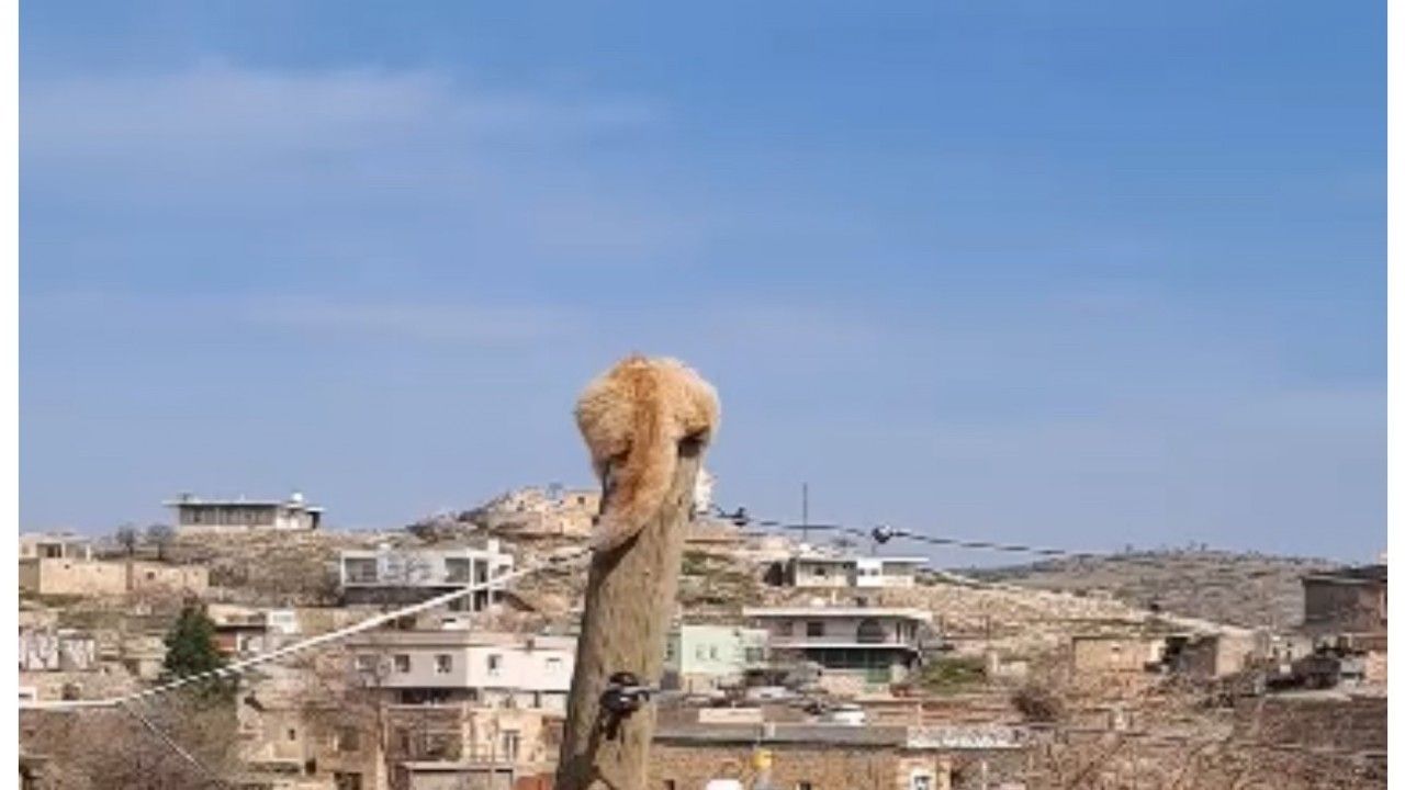 Mardin’in Mazıdağı ilçesinde köpekten kaçarak elektrik direğine tırmanan kedi, itfaiye erlerince kurtarıldı.