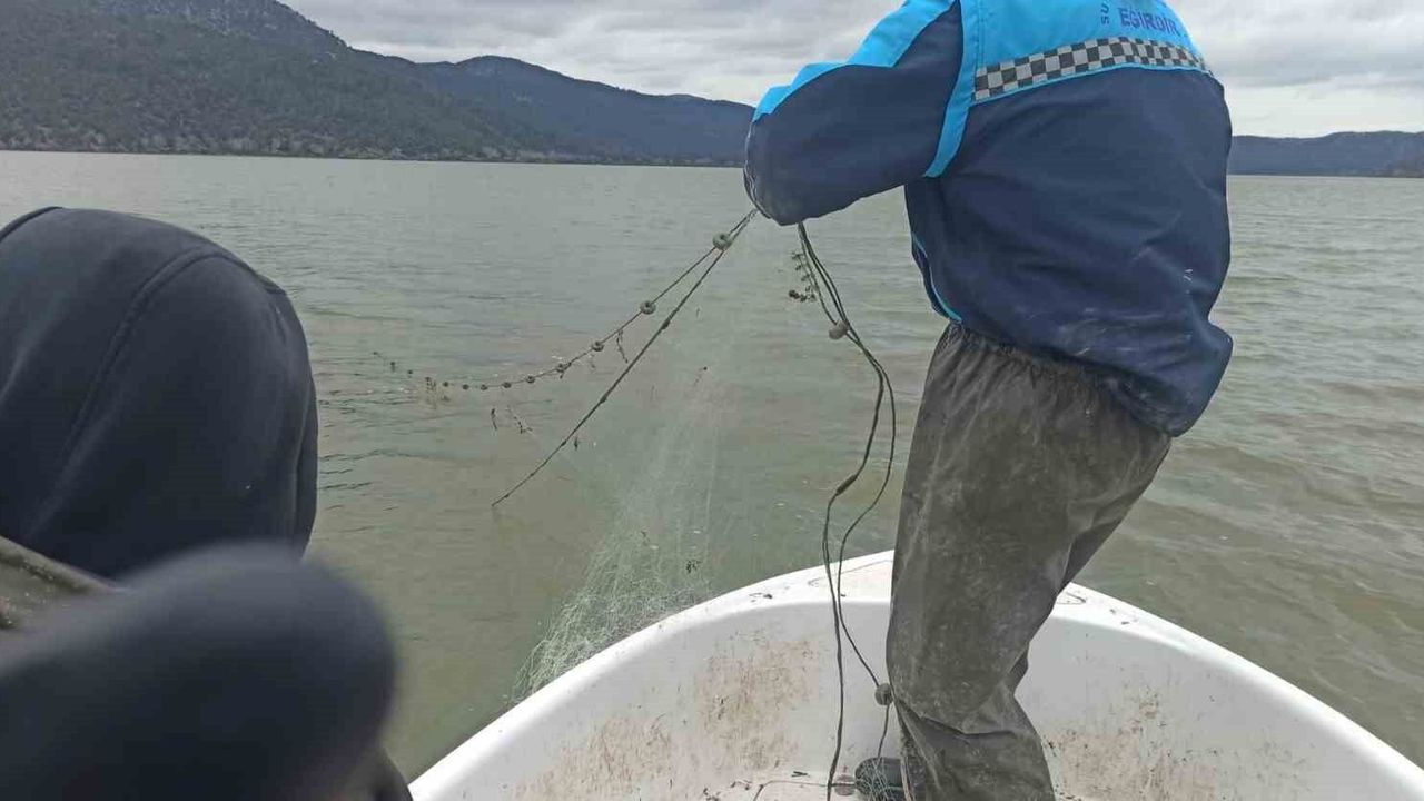 Isparta'nın Eğirdir ilçesindeki Kovada Gölü Milli Parkı'nda yapılan denetimlerde, yasak dönemde suya bırakılan yaklaşık 600 metre uzunluğunda uzatma ağı ele geçirilirken, ağdaki canlı balıklar tekrar göle bırakıldı.