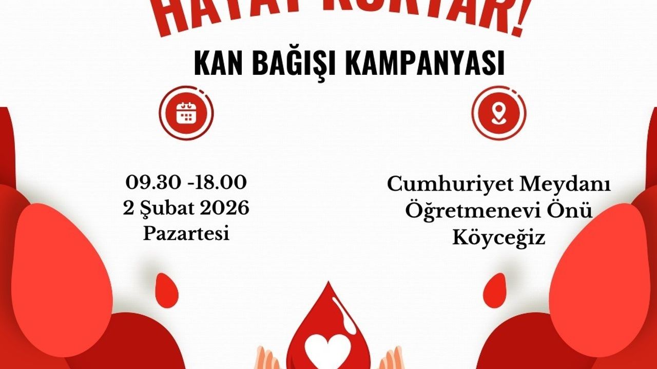 Köyceğiz Kaymakamlığı ve Türk Kızılay'ı iş birliğiyle düzenlenen kan bağışı kampanyası 2 Şubat 2026 tarihinde Pazartesi günü saat 09.30-18.00'da Cumhuriyet Meydanı-Öğretmenevi Önü'nde gerçekleştirilecek. Köyceğiz Kaymakamlığı ve Türk Kızılay'ı iş birliğiyle düzenlenen Kan Bağışı Kampanyasına; 'Bir ünite kan, birden fazla hayata umut olur. Sağlığınız uygunsa siz de bu iyilik hareketine katılın' mottosuyla tüm vatandaşlar davet edildi.