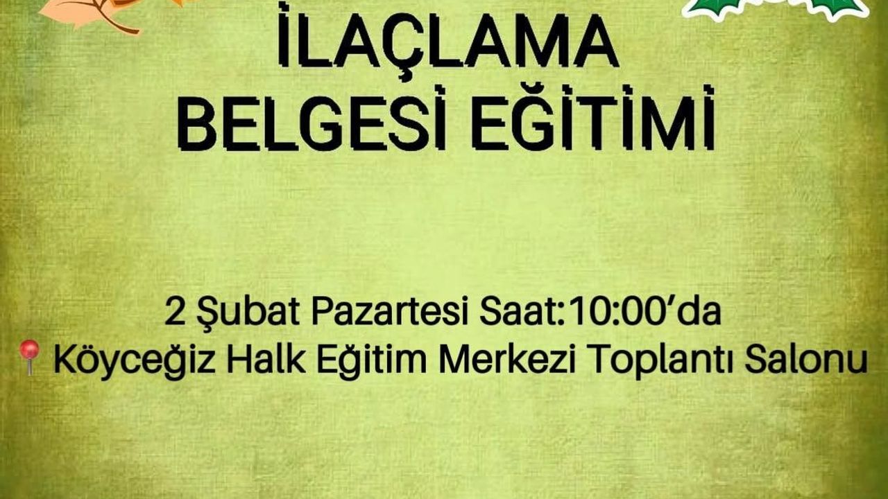 Köyceğiz İlçe Tarım ve Orman Müdürlüğü tarafından üreticilere yönelik ilaçlama belgesi eğitimi düzenlendi. Köyceğiz İlçe Tarım ve Orman Müdürlüğü tarafından ilaçlama belgesi eğitimi ile ilgili yapılan açıklamada, 'Değerli üreticilerimiz 2 Şubat Pazartesi günü saat 10.00'da Köyceğiz Halk Eğitim Merkezi toplantı salonunda ilaçlama belgesi eğitimi yapılacaktır. Daha önce alınan belgeler geçerlidir. Belgesi olmayan üreticilerimizin eğitime 1 adet fotoğraf ile katılması ilan olunur' ifadeleri kullanıldı.