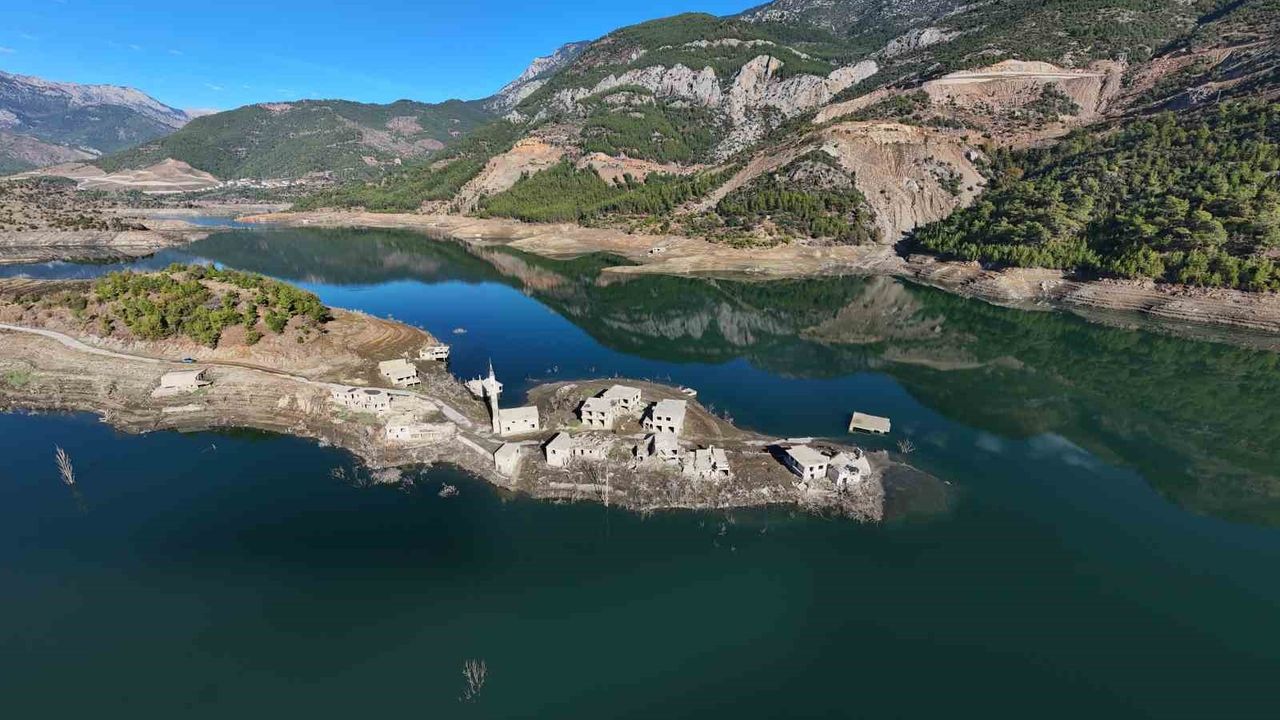 Mersin'in Anamur ilçesinde bulunan Alaköprü Barajı'nda bölgede yaşanan kuraklık nedeniyle su yaklaşık yüzde 80 oranında azaldı 11 yıl önce baraja gömülen köy evleri ve cami tamamen ortaya çıktı.