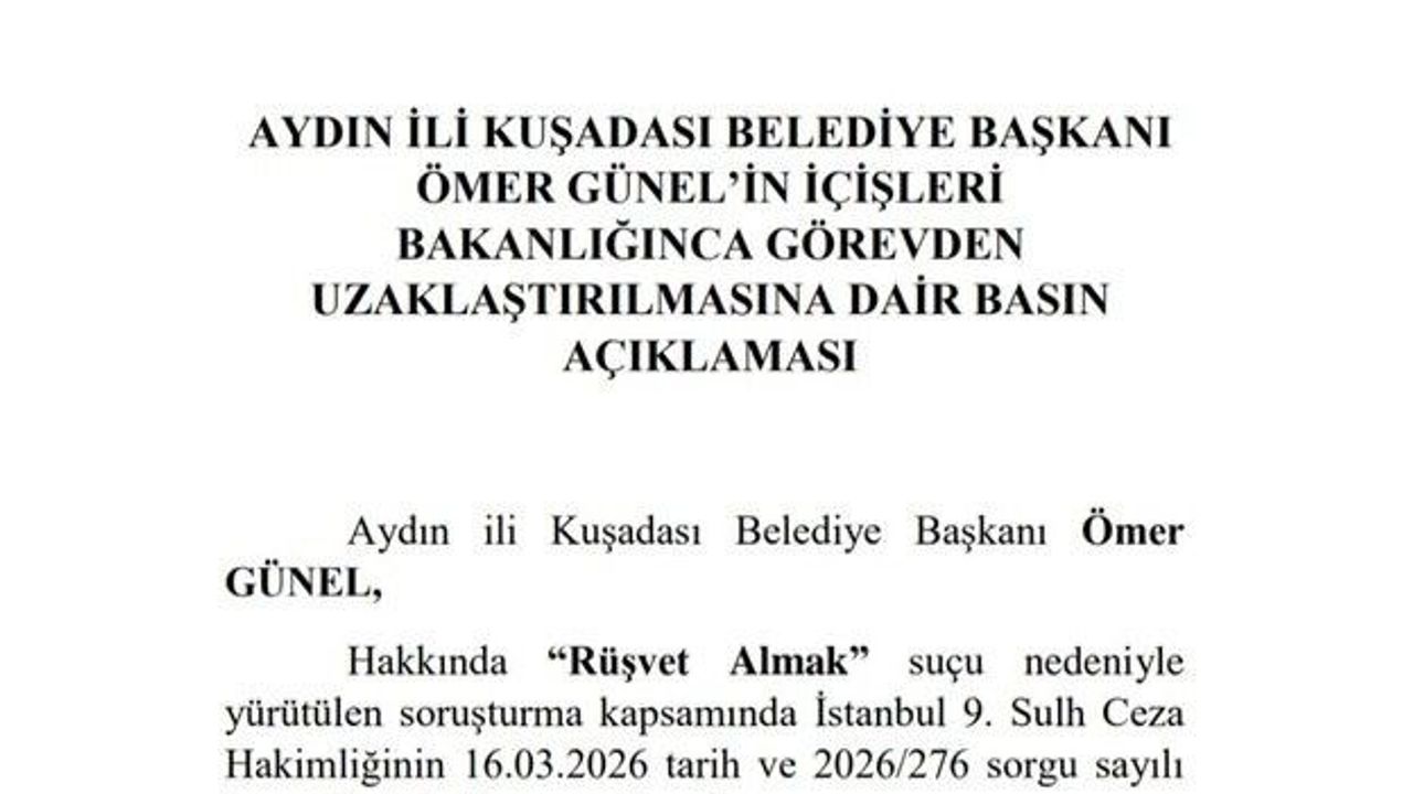 İçişleri Bakanlığı tarafından yapılan açıklamada, Aydın'ın Kuşadası ilçesinin Belediye Başkanı Ömer Günel'in görevden uzaklaştırıldığı duyuruldu. Açıklamada, 'Aydın ili Kuşadası Belediye Başkanı Ömer Günel hakkında 'Rüşvet Almak' suçu nedeniyle yürütülen soruşturma kapsamında İstanbul 9.Sulh Ceza Hakimliğinin 16.03.2026 tarih ve 2026/276 sorgu sayılı kararı ile tutuklanması üzerine, Anayasanın 127'nci maddesi ile 5393 sayılı Belediye Kanununun 47'nci maddesi uyarınca geçici bir tedbir olarak İçişleri Bakanlığı'nca görevden uzaklaştırılmıştır. Kamuoyuna saygıyla duyurulur' ifadeleri kullanıldı.