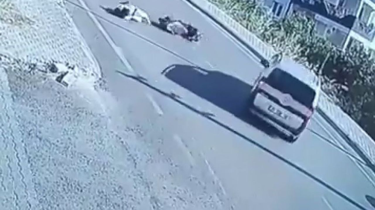 İki saat arayla meydana gelen kazalar güvenlik kameralarına anbean yansırken, görüntülerde caddeye bağlanmak isteyen araçları bir anda karşılarında gören motosiklet sürücülerinin panik fren yapması sonucu yere savrulması yer aldı.