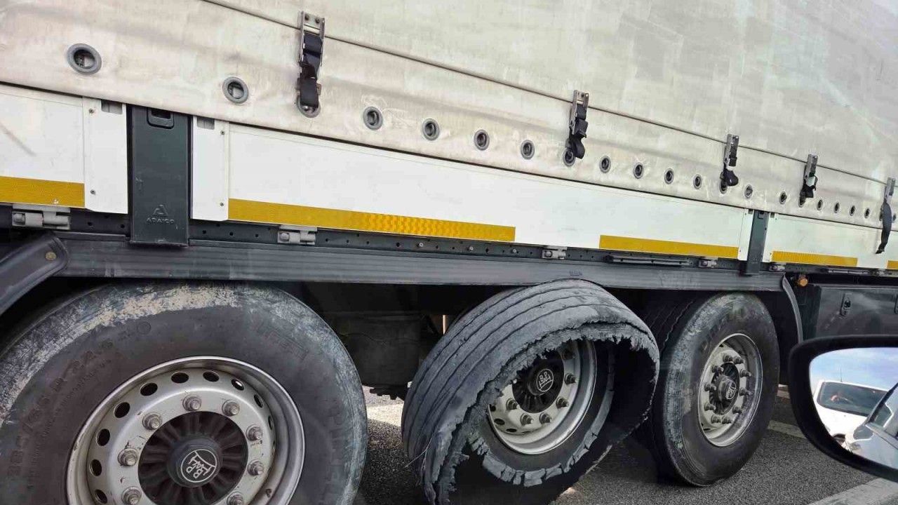 Bir süre bu şekilde trafikte devam eden tır şoförü, diğer sürücülerin kornalar ile uyarmasının ardından şehirlerarası yoldan ayrılarak, kontrol etmek üzere tırı yolun karşısına çekti ve gerekli incelemeleri yaptı.