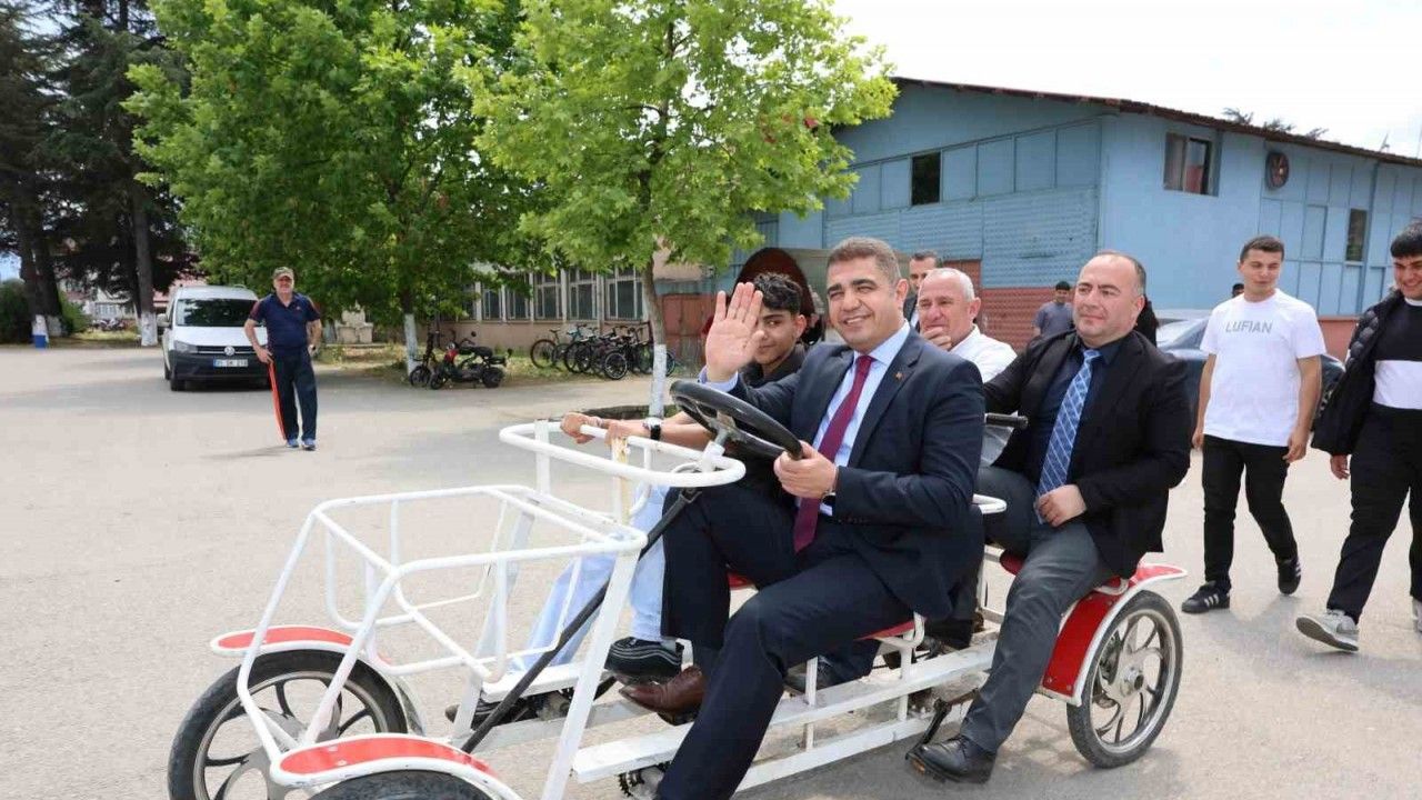 DÜZCE (İHA) – Düzce Borsa İstanbul Mesleki ve Teknik Anadolu Lisesi’nde açılan bilim fuarına katılan Vali Selçuk Aslan, öğrencilerin yaptığı bisiklete binerek dikkat çekti.