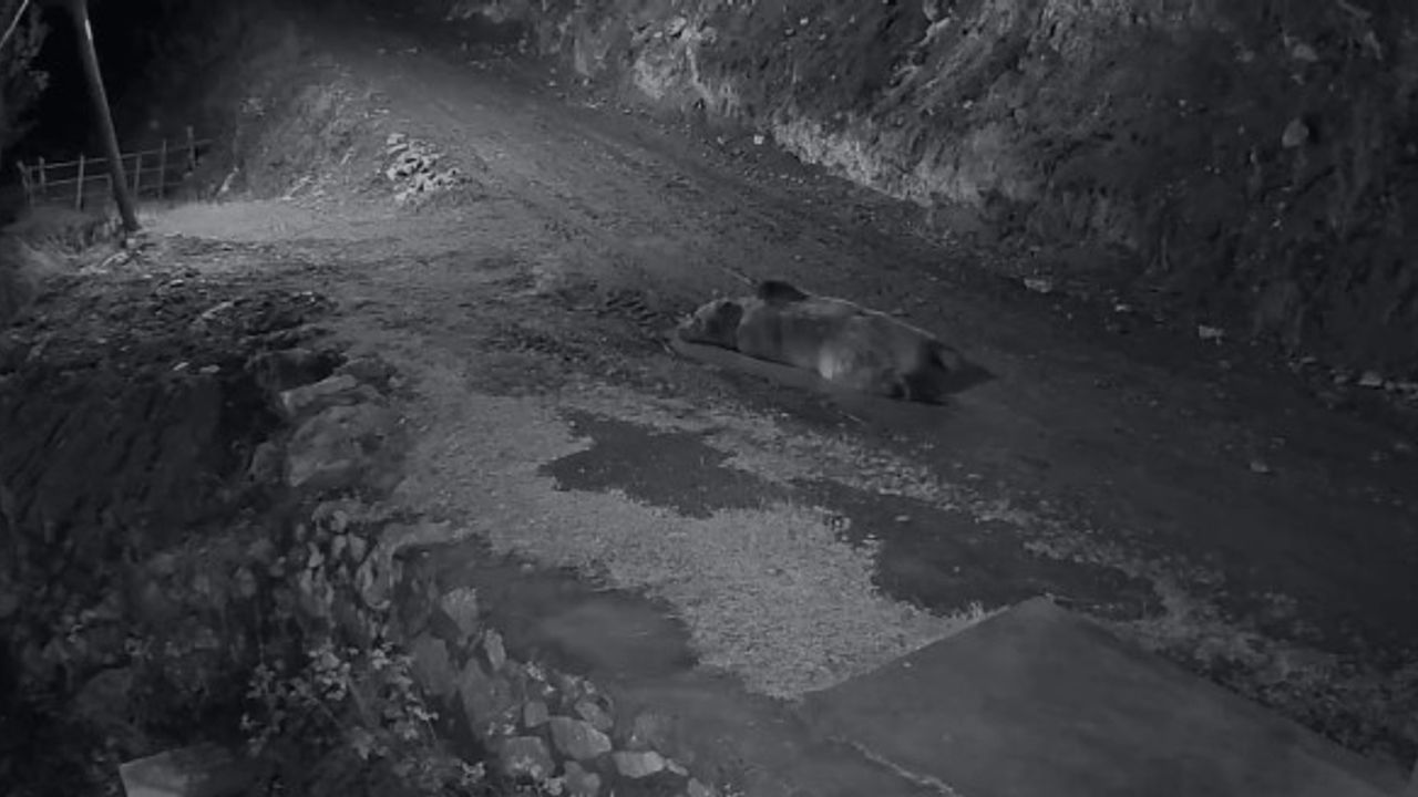 Trabzon’un Araklı ilçesi Bahçecik mahallesinde 10’a yakın eve giren ve evlere zarar veren ayının evinin önünde yattığını gören şahıs kamyoneti ile peşine düştü. O anlar kameralara yansıdı.
