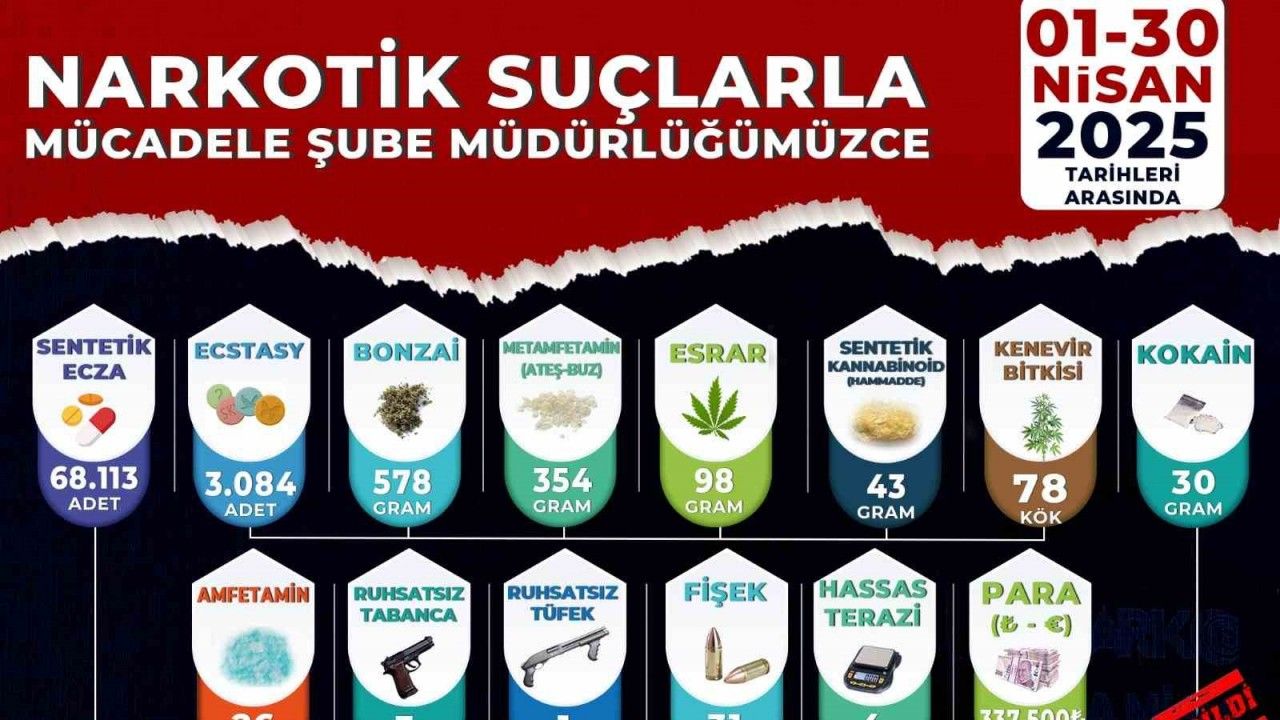 Gerçekleştirilen operasyonlarda çok sayıda uyuşturucu madde ve suç unsuru ele geçirildi. Nisan ayında yapılan operasyonlarda, 68 bin 113 adet sentetik ecza, 3 bin 84 adet ecstasy, 578 gram bonzai, 354 gram metamfetamin (ateş-buz), 98 gram esrar, 43 gram sentetik kannabinoid (ham madde), 78 kök kenevir bitkisi, 30 gram kokain, 26 gram amfetamin ele geçirildiği açıklandı.
