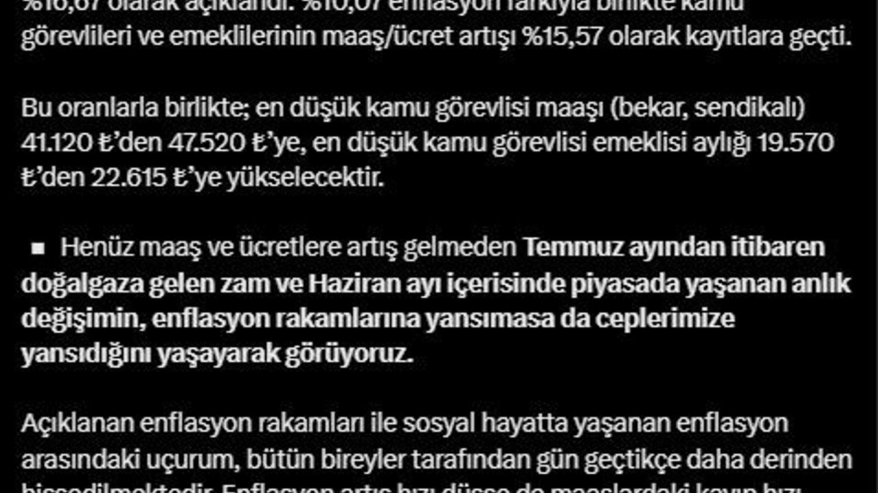 "2025 yılının Haziran ayı enflasyon oranı yüzde 1,37 ve 6 aylık enflasyon yüzde 16,67 olarak açıklandı. Yüzde 10,07 enflasyon farkıyla birlikte kamu görevlileri ve emeklilerinin maaş/ücret artışı yüzde 15,57 olarak kayıtlara geçti. Bu oranlarla birlikte en düşük kamu görevlisi maaşı (bekar, sendikalı) 41 bin 120 liradan 47 bin 520 liraya, en düşük kamu görevlisi emeklisi aylığı 19 bin 570 liradan 22 bin 615 liraya yükselecektir. Henüz maaş ve ücretlere artış gelmeden temmuz ayından itibaren doğalgaza gelen zam ve haziran ayı içerisinde piyasada yaşanan anlık değişimin enflasyon rakamlarına yansımasa da ceplerimize yansıdığını yaşayarak görüyoruz. Açıklanan enflasyon rakamları ile sosyal hayatta yaşanan enflasyon arasındaki uçurum, bütün bireyler tarafından gün geçtikçe daha derinden hissedilmektedir. Enflasyon artış hızı düşse de maaşlardaki kayıp hızı artarak devam etmektedir. Geçim derdinin arttığı, kira fiyatlarının uçtuğu, maaş ve ücretlerin yoksulluk sınırıyla açlık sınırı arasında sıkıştığı bir dönemde kamu görevlilerimize ve emeklilerimize refah payı verilmesi ve iyileştirme yapılması şart olmuştur."