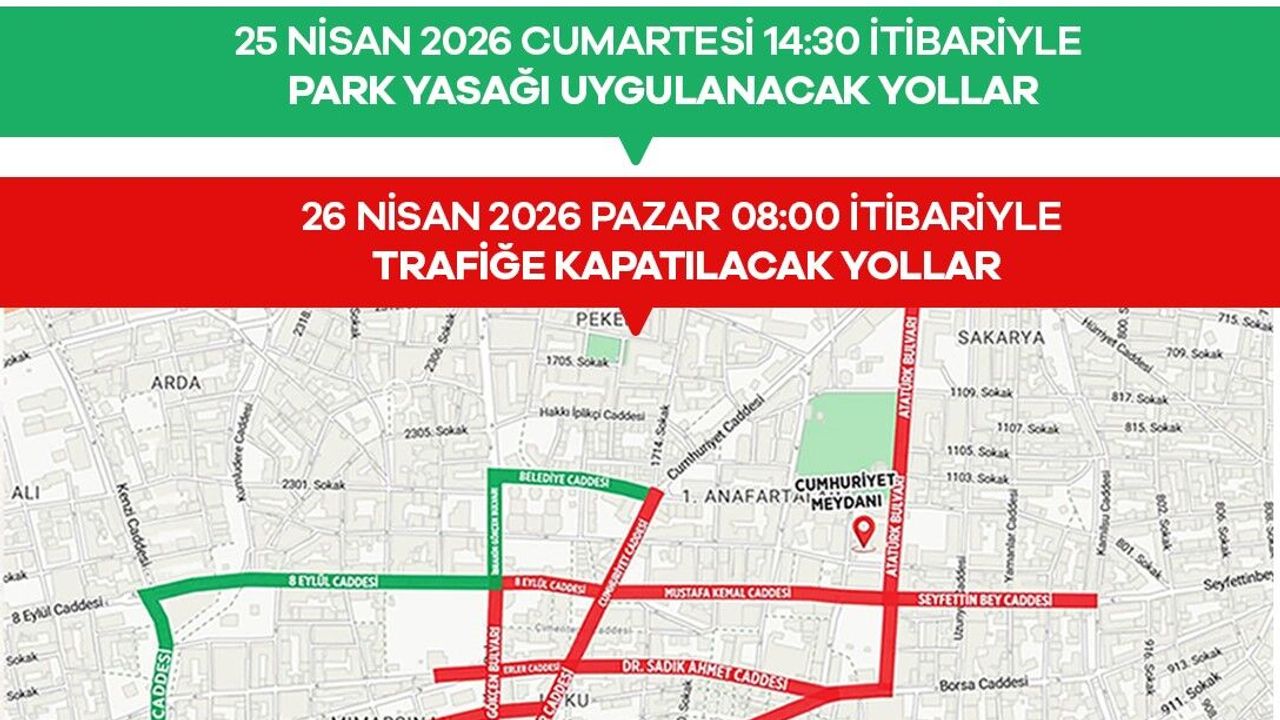 Cumhuriyet Meydanı'na çıkan yollar ile birlikte, Atatürk Bulvarı üzeri (Cumhuriyet Caddesi ile Mustafa Kemal Paşa Caddesi arası), Sultan Camii önüne çıkan yollar, Valilik önüne çıkan yollar, Seyfettin Bey Caddesi üzeri (Kamilsu Caddesi ile Atatürk Bulvarı arası), Mustafa Kemal Paşa Caddesi üzeri (Atatürk Bulvarı ile Cumhuriyet Caddesi arası), 8 Eylül Caddesi üzeri (Cumhuriyet Caddesi ile İbrahim Gökçen Bulvarı arası), İzmir Caddesi üzeri (Mustafa Kemal Paşa Caddesi ile Murat Caddesi arası), 2507 Sokak üzeri (2500 Sokak ile İzmir Caddesi arası), 2505 Sokak üzeri (2501 Sokak ile İzmir Caddesi arası), Çarşı Bulvarı üzeri (İzmir Caddesi ile Dr. Sadık Ahmet Caddesi arası),Murat Caddesi üzeri (1800 Sokak ile İbrahim Gökçen Bulvarı arası), İbrahim Gökçen Bulvarı üzeri (8 Eylül Caddesi ile İzmir Caddesi arası) olan yollar trafiğe kapatılacak.