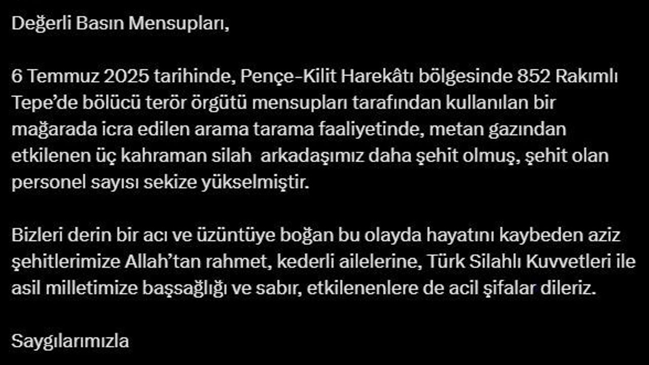 Milli Savunma Bakanlığı’nın sosyal medya hesabından yapılan paylaşımda, Pençe-Kilit Harekatı bölgesinde metan gazından etkilenen 3 askerin daha şehit olduğunu belirtilerek, "6 Temmuz, Pençe-Kilit Harekatı bölgesinde 852 rakımlı Tepe’de bölücü terör örgütü mensupları tarafından kullanılan bir mağarada icra edilen arama tarama faaliyetinde, metan gazından etkilenen üç kahraman silah arkadaşımız daha şehit olmuş, şehit olan personel sayısı sekize yükselmiştir. Bizleri derin bir acı ve üzüntüye boğan bu olayda hayatını kaybeden aziz şehitlerimize Allah’tan rahmet, kederli ailelerine, Türk Silahlı Kuvvetleri ile asil milletimize başsağlığı ve sabır, etkilenenlere de acil şifalar dileriz" ifadelerine yer verildi.