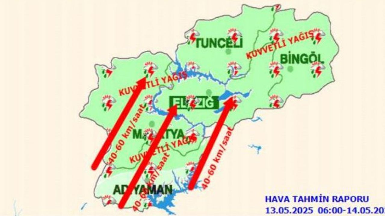 Meteoroloji 13. Bölge Müdürlüğü’nden yapılan açıklamada, "Bölge genelinde havanın parçalı ve çok bulutlu, aralıklı sağanak ve gök gürültülü sağanak yağışlı geçeceği tahmin edilmektedir. Yağışların Elazığ, Malatya, Tunceli ve Bingöl çevreleri ile Adıyaman’ın kuzey kesimlerinde (Gölbaşı, Tut, Sincik, Çelikhan, Gerger) yerel kuvvetli olması beklendiğinden yaşanabilecek ani sel, su baskını, yıldırım, ulaşımda aksamalar, yerel dolu yağışı, yağış anında kuvvetli rüzgar ve fırtına gibi olumsuzluklara karşı dikkatli ve tedbirli olunmalıdır" denildi.