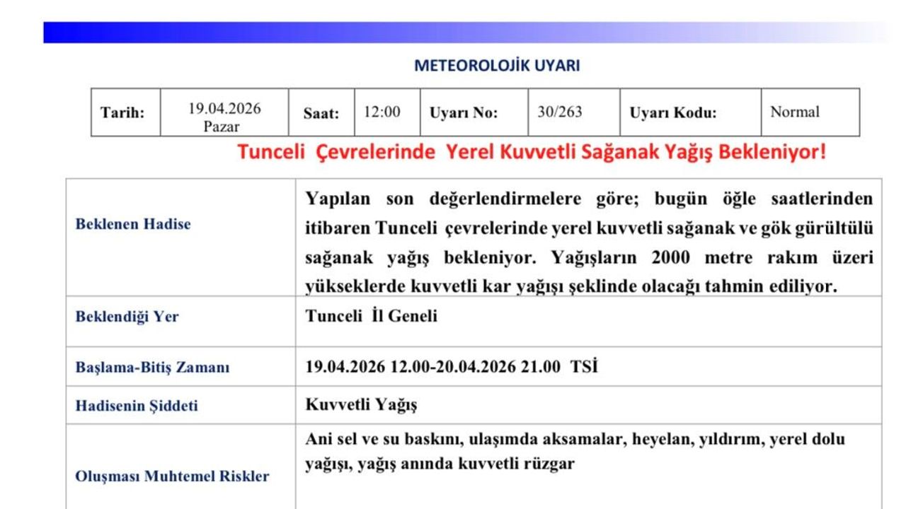 Meteoroloji 13. Bölge Müdürlüğü tarafından yapılan uyarıda, 'Yapılan son değerlendirmelere göre; bugün öğle saatlerinden itibaren Tunceli çevrelerinde yerel kuvvetli sağanak ve gök gürültülü sağanak yağış bekleniyor. Yağışların 2000 metre rakım üzeri yükseklerde kuvvetli kar yağışı şeklinde olacağı tahmin ediliyor. Oluşması muhtemel risklere karşı tedbirli ve dikkatli olunması gerekmektedir' denildi.