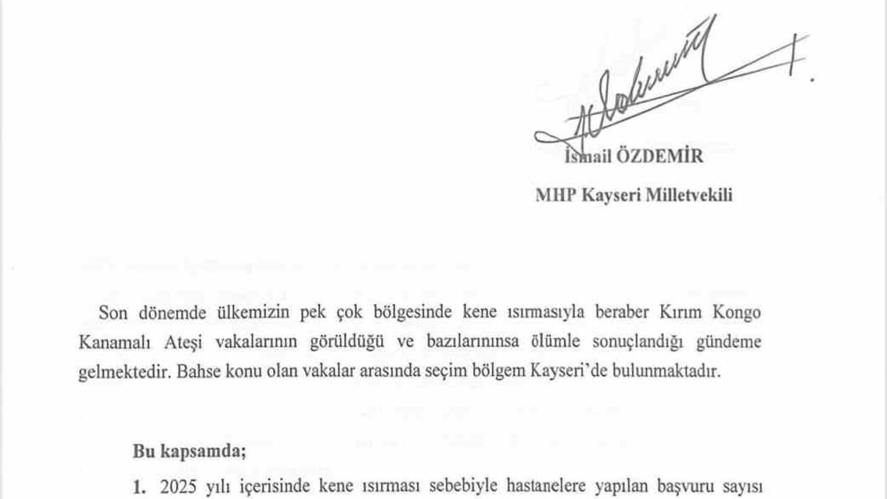 Milliyetçi Hareket Partisi Kayseri Milletvekili ve Genel Başkan Yardımcısı İsmail Özdemir, kene ısırması vakaları ile ilgili Sağlık Bakanlığı ile Tarım ve Orman Bakanlığı’na soru önergesi verdiklerini söyledi.