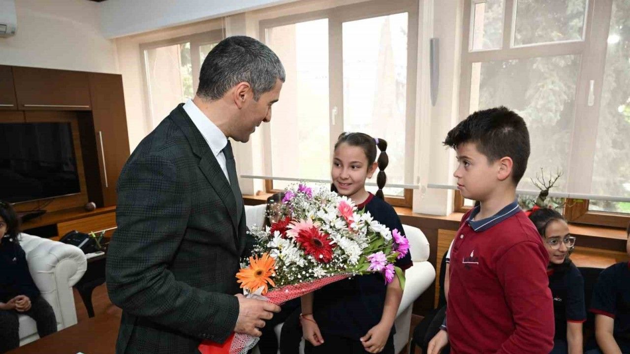 Uşak Öğretmen Mahmut Özgöbek İlkokulu 4-C sınıfı öğrencilerinden, "Maarifin İzinde Eğitimde İyi Örnekler Projesi" kapsamında kaleme aldıkları Çocuğum Yazarım adlı kitaplarını Vali Aktaş’a taktim etti.