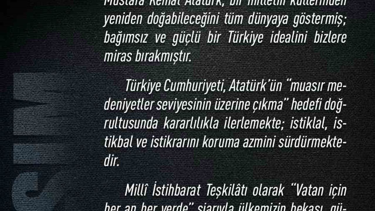 "Cumhuriyetimizin bânisi Gazi Mustafa Kemal Atatürk’ü, ebediyete irtihalinin 87. yıl dönümünde saygı ve rahmetle anıyorum. Aziz milletimizin asil ruhunu ve birlik azmini temsil eden Millî Mücadelenin Başkomutanı Gazi Mustafa Kemal Atatürk, bir milletin küllerinden yeniden doğabileceğini tüm dünyaya göstermiş; bağımsız ve güçlü bir Türkiye idealini bizlere miras bırakmıştır. Türkiye Cumhuriyeti, Atatürk’ün ‘muasır medeniyetler seviyesinin üzerine çıkma’ hedefi doğrultusunda kararlılıkla ilerlemekte; istiklal, istikbal ve istikrarını koruma azmini sürdürmektedir. Millî İstihbarat Teşkilâtı olarak ‘Vatan için her an her yerde’ şiarıyla ülkemizin bekası, güvenliği ve huzuru için azim ve gayretle çalışmayı sürdürüyoruz. Bu vesileyle Gazi Mustafa Kemal Atatürk’ü ve tüm silah arkadaşlarını ve vatan uğruna can veren tüm şehitlerimizi rahmet, hürmet ve şükranla yâd ediyorum."
