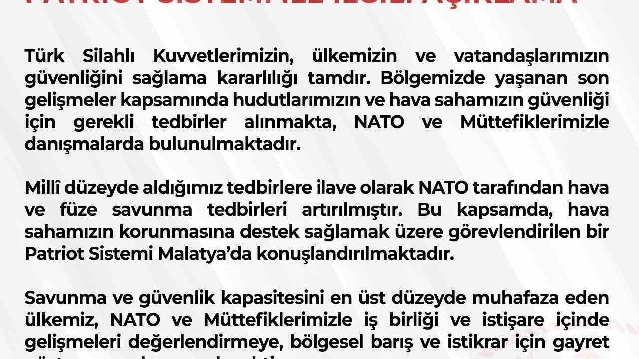 'Türk Silahlı Kuvvetlerimizin, ülkemizin ve vatandaşlarımızın güvenliğini sağlama kararlılığı tamdır. Bölgemizde yaşanan son gelişmeler kapsamında hudutlarımızın ve hava sahamızın güvenliği için gerekli tedbirler alınmakta, NATO ve müttefiklerimizle danışmalarda bulunulmaktadır. Milli düzeyde aldığımız tedbirlere ilave olarak NATO tarafından hava ve füze savunma tedbirleri artırılmıştır. Bu kapsamda, hava sahamızın korunmasına destek sağlamak üzere görevlendirilen bir Patriot sistemi Malatya'da konuşlandırılmaktadır. Savunma ve güvenlik kapasitesini en üst düzeyde muhafaza eden ülkemiz, NATO ve müttefiklerimizle iş birliği ve istişare içinde gelişmeleri değerlendirmeye, bölgesel barış ve istikrar için gayret göstermeye devam edecektir.'