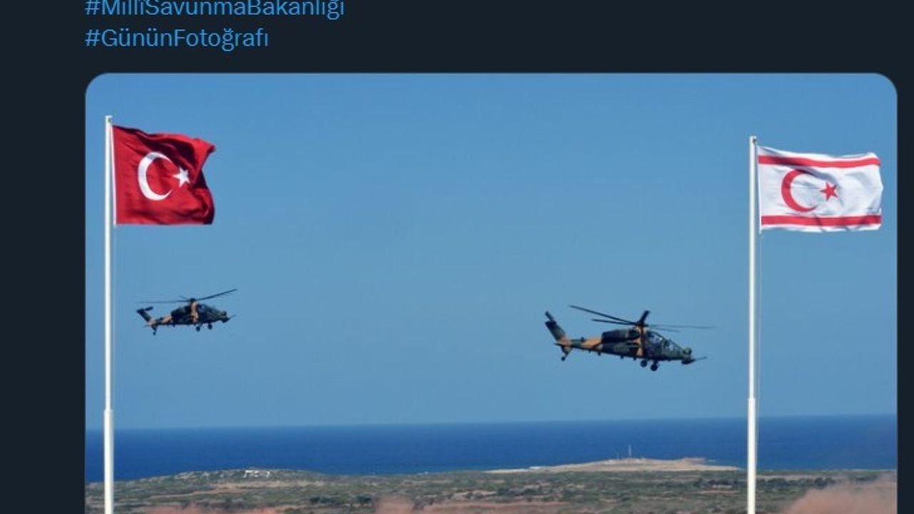 MSB, içerisinde KKTC ve Türk Bayrağı’nın bulunduğu bir fotoğrafı "Unutana Hatırlatırız" notuyla paylaştı. Ayrıca fotoğrafta bayraklar arasında, yerli imkanlarla üretilen, ATAK helikopterler de yer aldı.