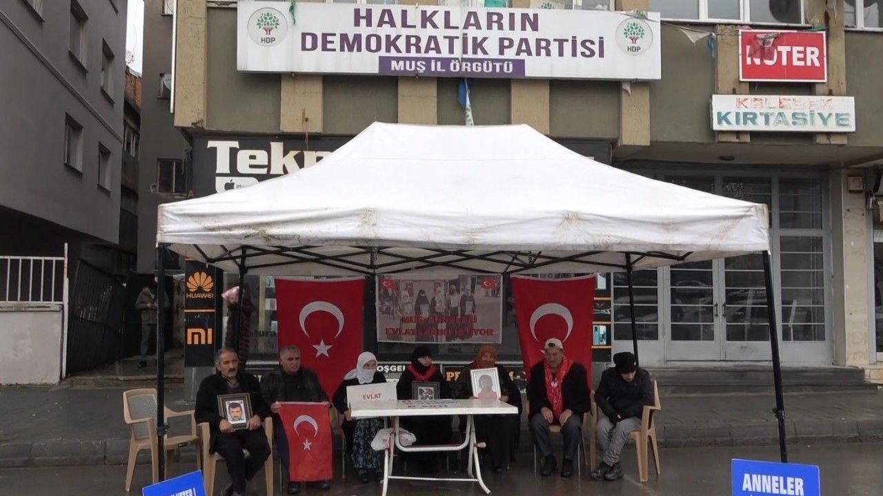 Çocuklarının terör örgütü PKK mensupları tarafından dağa kaçırıldığı iddiasıyla HDP Muş İl Başkanlığı önünde oturma eylemi başlatan aileler, 126 haftadır kararlı bir şekilde devam ettirdikleri evlat nöbetini sürdürüyor. HDP İl Başkanlığı önünde toplanan aileler, "Halk düşmanı parti", "Evlatlarımızı vereceksiniz", "Ha HDP ha PKK", "Türk-Kürt kardeştir, HDP kalleştir", "Halkı dolandıran parti", "Anneler direniyor", "Artık yeter yakamızdan düşün" ve "Yeter artık evlatlarımızı bırakın" yazılı pankartlar açtı. Her çarşamba parti binası önünde bir araya gelen anne ve babalar, fotoğraflarını taşıdıkları çocuklarına teslim olmaları için çağrıda bulundu.