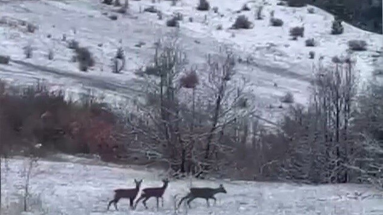 Kızıl geyikler, Erzincan'ın Refahiye ilçesinde nadir anlara sahne oldu. Kar yağışı altında doğada beslenen üç kızıl geyik, cep telefonu kamerasıyla görüntülendi.