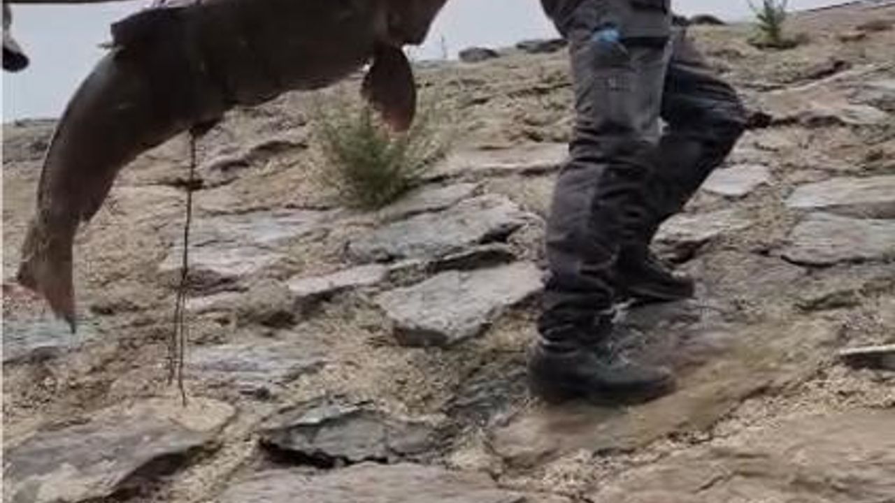 Elazığ'da amatör balıkçılar, Murat Nehri'nde at-çek yöntemiyle 60 kiloluk dev bir turna balığı yakaladı. Yakaladığı dev turnayı kıyıya çıkaran balıkçılar, 60 kiloluk dev turna balığını taşıyamayınca çam sırığına bağladıktan sonra omuzlarda taşıdılar. 2 balıkçı yakalanan dev turna balığını taşımak için zorlanırken, o anlar cep telefonu ile kayıt edildi.