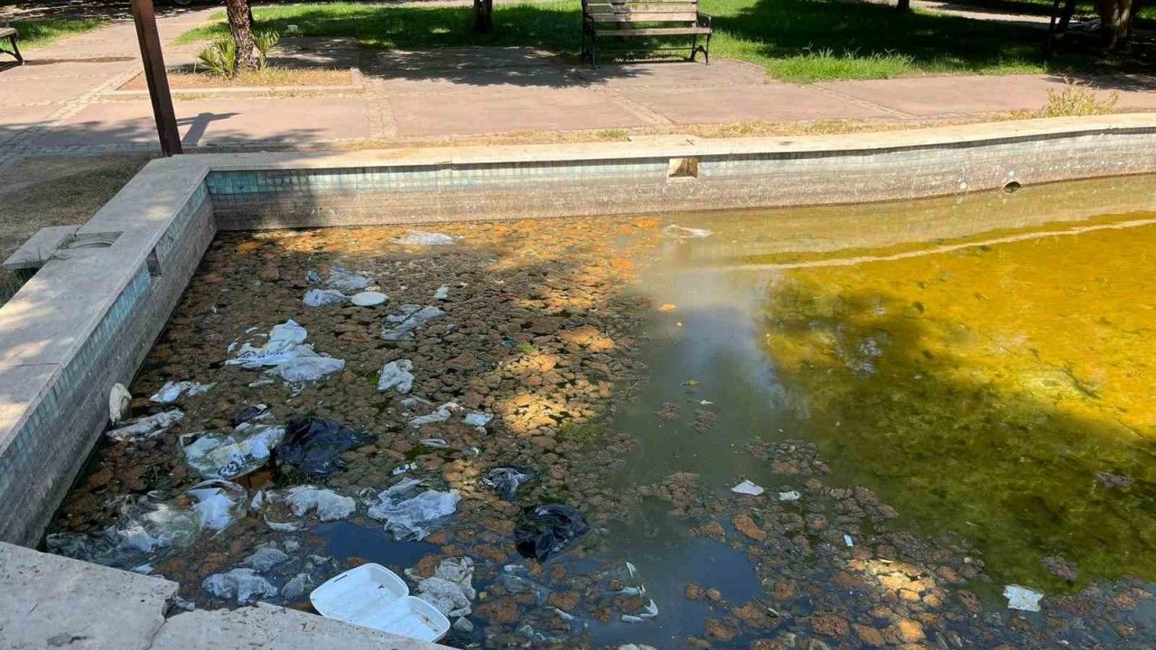 Cumhuriyet Mahallesi’ndeki parkta sulama sistemi çalışmasına rağmen otlar diz boyuna kadar uzarken, spor aletleri ise sular içinde kalarak kullanılmaz hale geldi. Parkın içerisinde yer alan süs havuzunun yosun ve çöple kaplanmış olması da dikkat çekti.