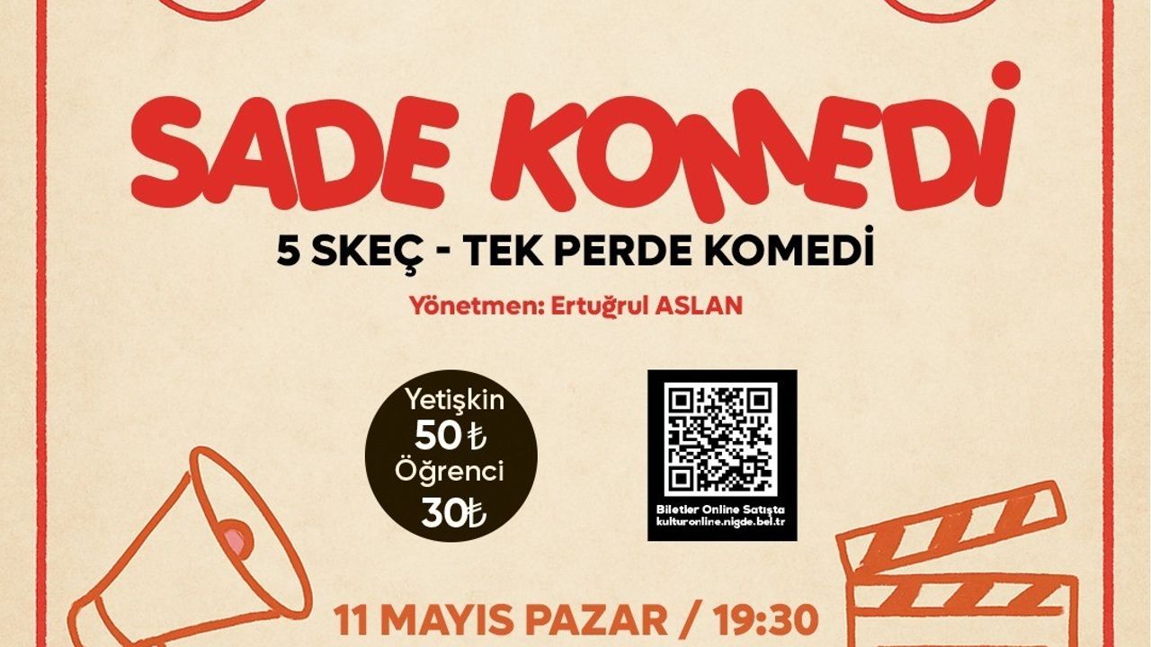 Yönetmenliğini Ertuğrul Aslan’ın üstlendiği ’Sade Komedi’, beş farklı skeçten oluşuyor. Her skeç, izleyiciyi gündelik hayatın içinde sıkça karşılaştığı olaylara farklı bir gözle bakmaya davet ediyor. Mizahın diliyle toplumsal davranışlar, insan ilişkileri ve alışkanlıklar eleştirel bir bakışla sahneye taşınıyor. Oyunun temposu yüksek, dili sade ve samimi. Seyirciyi sadece güldürmekle kalmıyor, aynı zamanda düşündüren ve kendini sorgulatan bir yapıya da sahip. Niğde Belediyesi, etkinliğin herkes tarafından ulaşılabilir olması için bilet fiyatlarını uygun seviyede tuttu. Yetişkin biletleri 50 TL, öğrenci biletleri ise 30 TL olarak belirlendi. Bilet satışları, belediyeye ait kultursanat.nigde.bel.tr adresinden online olarak yapılıyor.