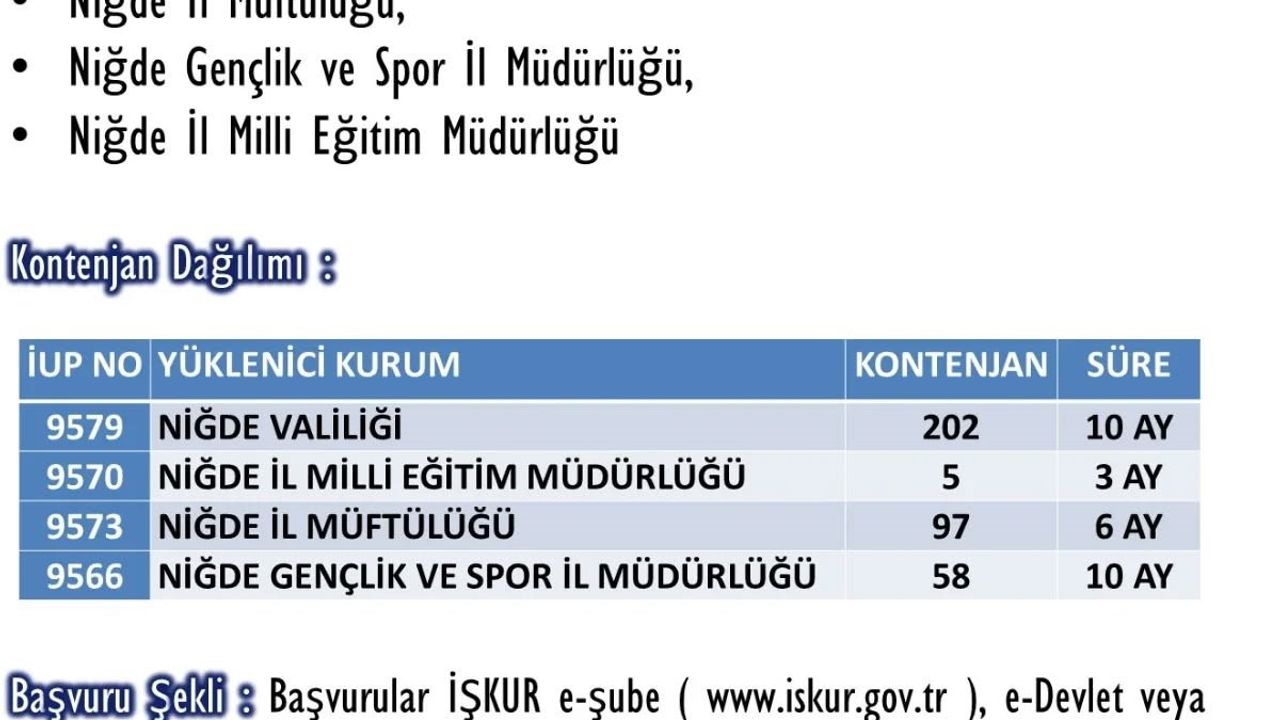 İŞKUR İl Müdürlüğü, Niğde Valiliği, İl Müftülüğü, Gençlik ve Spor İl Müdürlüğü ile İl Milli Eğitim Müdürlüğü bünyesinde toplam 362 kişilik kontenjan açıldığını duyurdu.