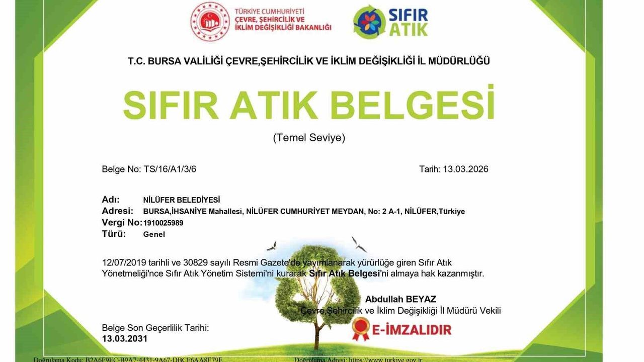 Nilüfer Belediyesi, 12 Temmuz 2019 tarihli Sıfır Atık Yönetmeliği kapsamında kurduğu sistemle Bursa Valiliği Çevre, Şehircilik ve İklim Değişikliği İl Müdürlüğü tarafından verilen Temel Seviye Sıfır Atık Belgesi'ni almaya ve yenilemeye hak kazandı. Söz konusu belge, 13 Mart 2031 tarihine kadar geçerliliğini koruyacak.