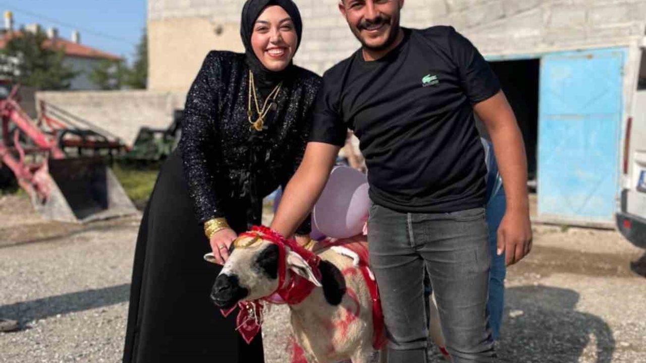 Konya’nın Karapınar ilçesinde bir genç nişanlısına süslediği koyunu hediye etti.