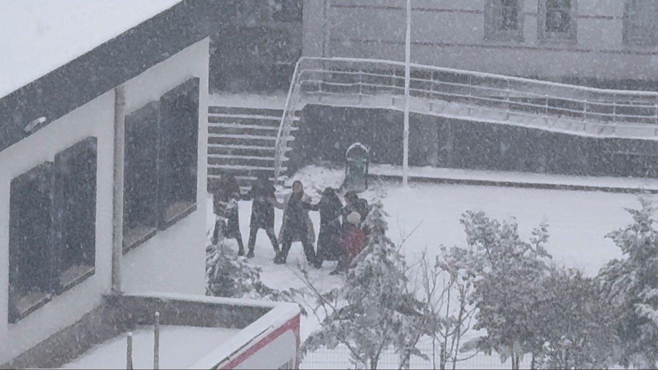 Diyarbakır'ın Kayapınar ilçesindeki bir okulda öğrenciler, kar yağışını hoparlörden çalınan oyun havalarıyla kutladı.