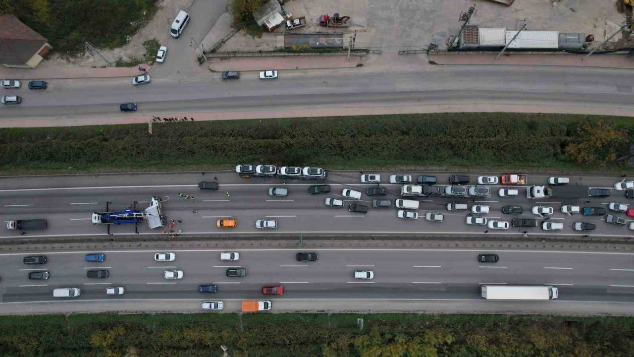 Edinilen bilgiye göre, otoyolun Arifiye ilçesi Adapazarı gişeler mevkii Ankara istikametinde İ.G. idaresindeki 41 TN 907 çekici plakalı SUV tarzı araç yüklü tır ile çarpışan S.Ç. idaresindeki 41 AOH 551 plakalı nakliyat kamyoneti devrildi. Kazada yaralanan olmazken, otoyolun Ankara istikametinde kilometrelerce araç kuyruğu oluştu. Bölgeye jandarma ve kara yolları ekipleri sevk edildi. Kontrollü bir şekilde tek şeritten sağlanan trafik, kamyonetin bulunduğu yerden kaldırılması ile normal seyrine döndü.