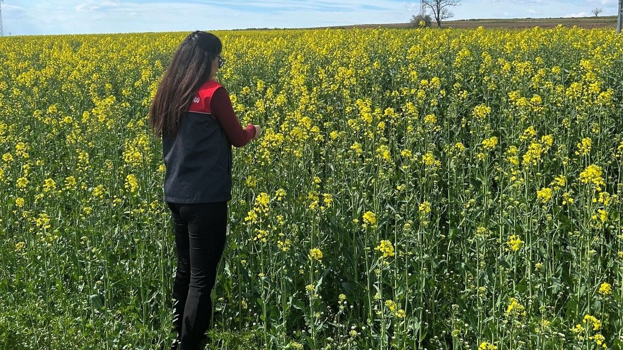 Kırklareli'nin Pehlivanköy ilçesinde çiçek açan kanola bitkininin fizyolojik gelişimi ve toprak nem durumu yerinde incelendi.