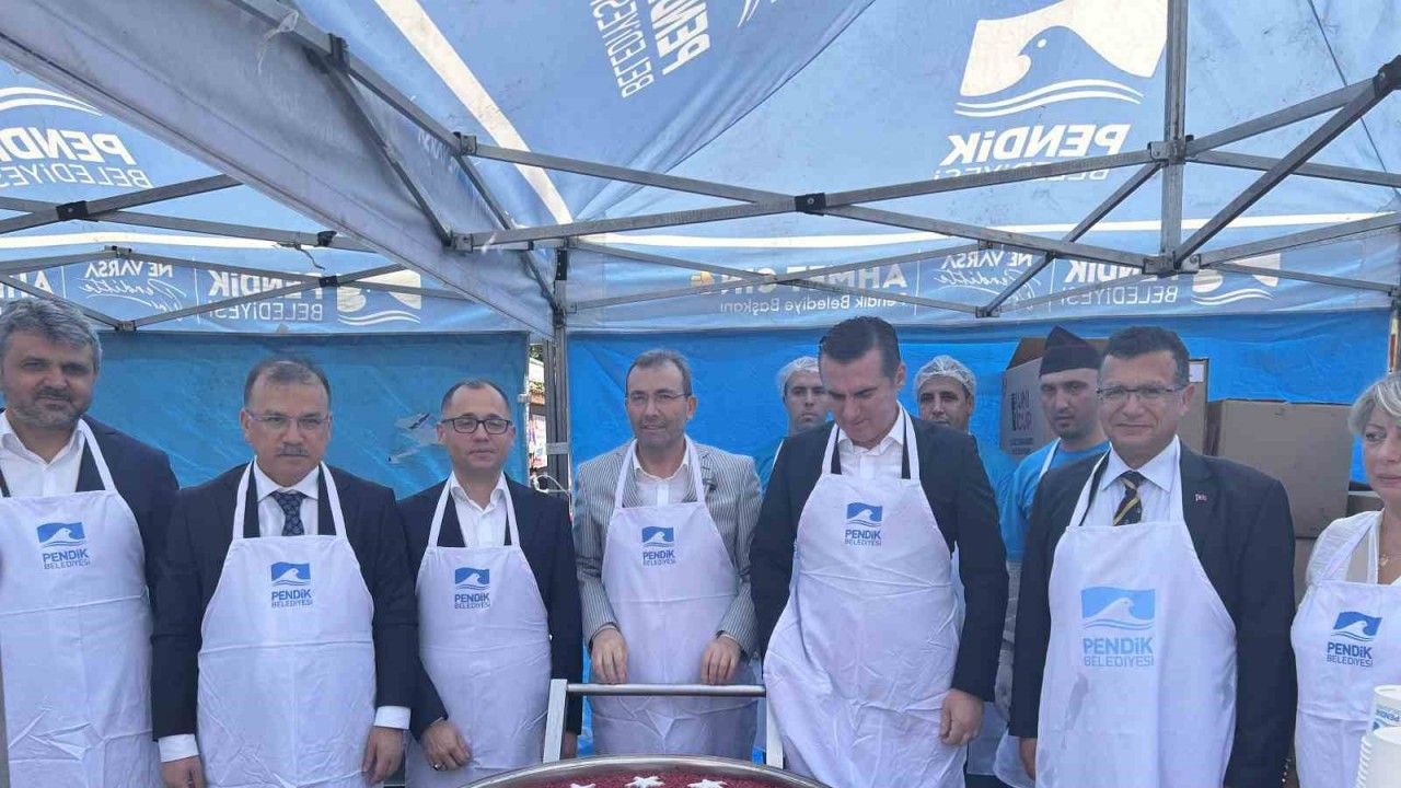 Pendik’te Muharrem Ayı vesilesiyle her sene olduğu gibi bu sene de aşure dağıtımı gerçekleştirildi. Türk bayrağı deseniyle süslenen ve 12 bin kişilik hazırlanan aşure, genci yaşlısı her yaştan vatandaşa ikram edildi. Pendik Belediye Başkanı Ahmet Cin de vatandaşa aşure dağıttı.