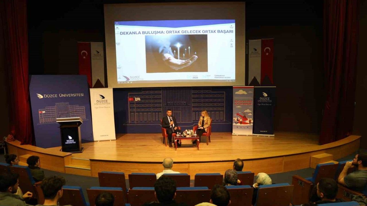 Düzce Üniversitesi Kariyer Geliştirme ve Mezun İzleme Uygulama Araştırma Merkezi (KARMER) tarafından, öğrencilerin kariyer planlamalarına rehberlik etmek ve akademi–öğrenci etkileşimini güçlendirmek amacıyla düzenlenen "Dekanla Buluşma: Ortak Gelecek, Ortak Başarı" etkinliği, Orman Fakültesi Dekanı Prof. Dr. Abdurrahim Aydın’ın katılımıyla Cumhuriyet Konferans Salonu’nda gerçekleştirildi. KARMER Müdürü Dr. Öğr. Üyesi Senem Çolak Yazıcı’nın yönetiminde gerçekleşen etkinlikte, öğrencilerin mesleki farkındalıklarını artırmak, kariyer hedeflerini daha bilinçli biçimde şekillendirmelerini sağlamak ve fakülte–öğrenci iletişimini güçlendirmek amacıyla önemli paylaşımlar yapıldı.