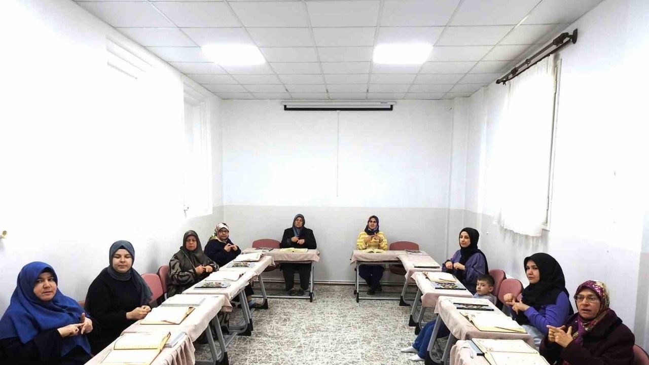 Gaziantep’te işitme engelli kadın kursiyerler, Ramazan ayının önemli ibadetlerden biri olan mukabele geleneğini işaret diliyle sürdürüyor.