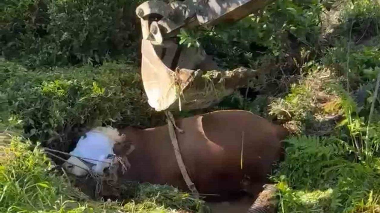 Rize’de bağını kopararak çay bahçesindeki çukura düşen kurbanlık boğa iş makinesi yardımıyla çıkarıldı.