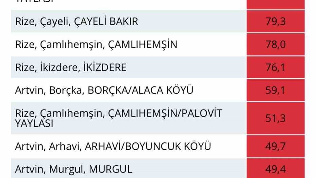 Rize İl Afet ve Acil Durum Müdürlüğü’nden alınan bilgiye göre, Rize’nin bir çok noktasına son 24 saatte 110 kg ve üstü yağış düşerken, en fazla yağış Rize merkeze bağlı Taşköprü’ye 136,2 kg olarak düştü. Taşköprü’yü İkizdere ilçesinin Çağrankaya Yaylası 129 kg, Güneysu Handüzü Yaylası 124,4 kg ve Rize-Andon 110,9 kg ile izledi.