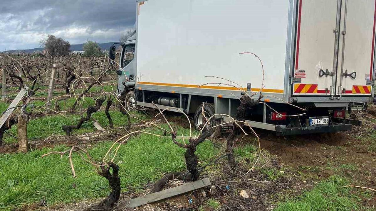 Denizli'nin Buldan ilçesinde, kazalarla sık sık gündeme gelen Buldan karayolunda meydana gelen trafik kazasında bir kamyon üzüm bağına girdi.