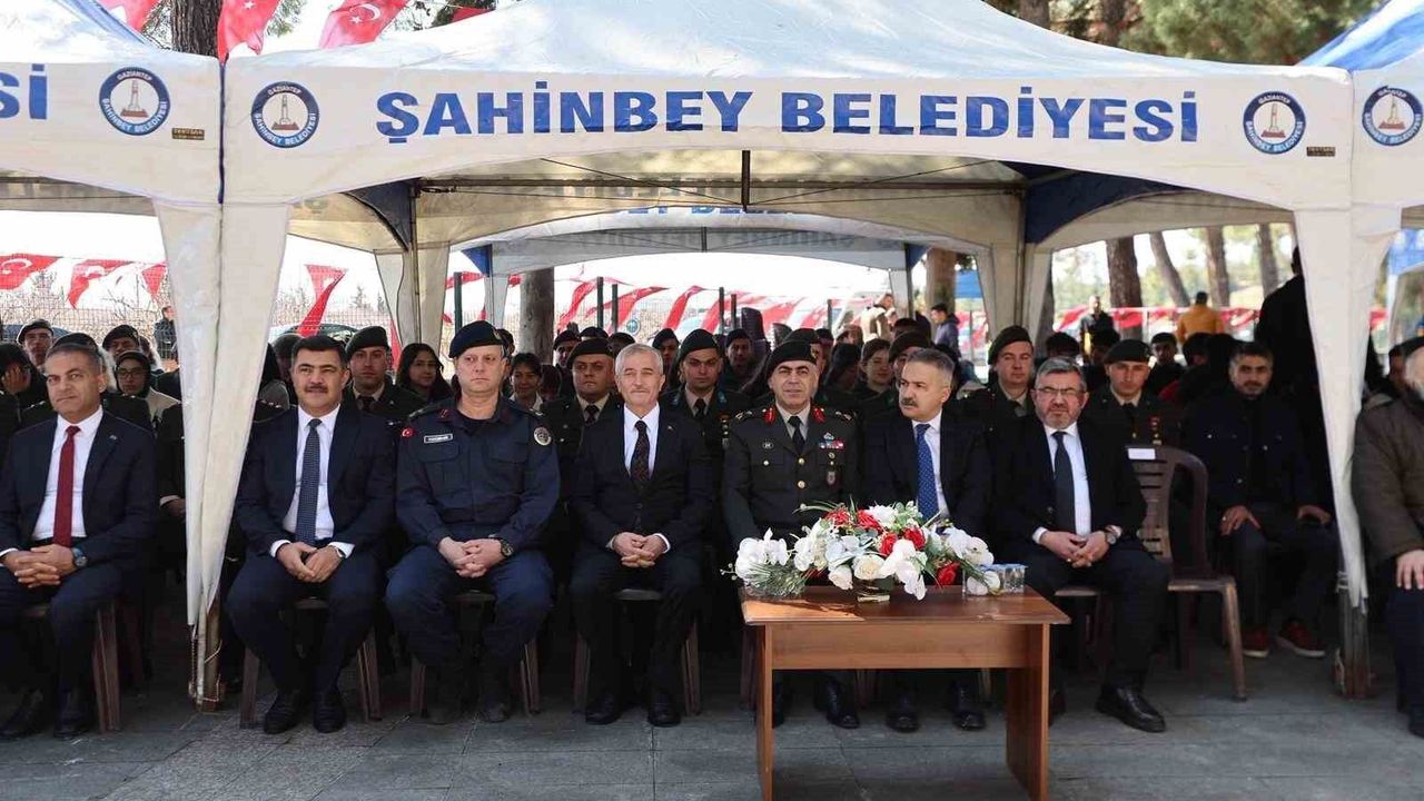 Düzenlenen tören, Şehitler için saygı duruşu, İstiklal Marşının okunması ve saygı atışıyla başladı. Ardından protokol tarafından buket sunumu yapıldı, törene katılan öğrenciler, Şahinbey şiirini ve İstiklal Marşını okudular.