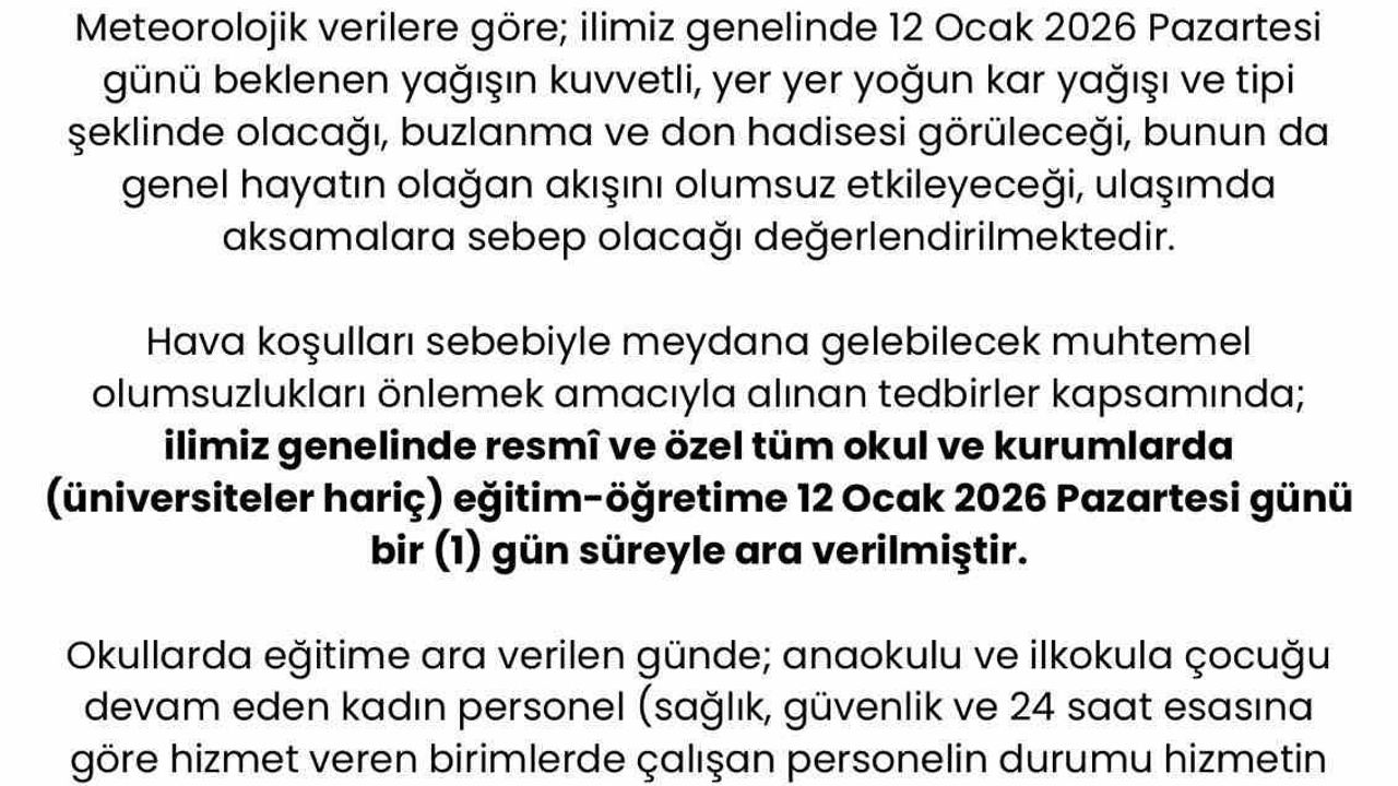 Sakarya Valiliği'nden yapılan açıklamada, bu gece başlaması beklenen yoğun kar yağışı ve oluşabilecek buzlanmalar nedeniyle il genelinde eğitim-öğretime 12 Ocak tarihinde 1 gün süreyle ara verildiği belirtildi. Valilik kararı doğrultusunda, okulların tatil edildiği gün kamu kurumlarında çalışan malul, engelli, ağır kronik rahatsızlığı bulunan ve hamile personel de idari izinli sayılacak.