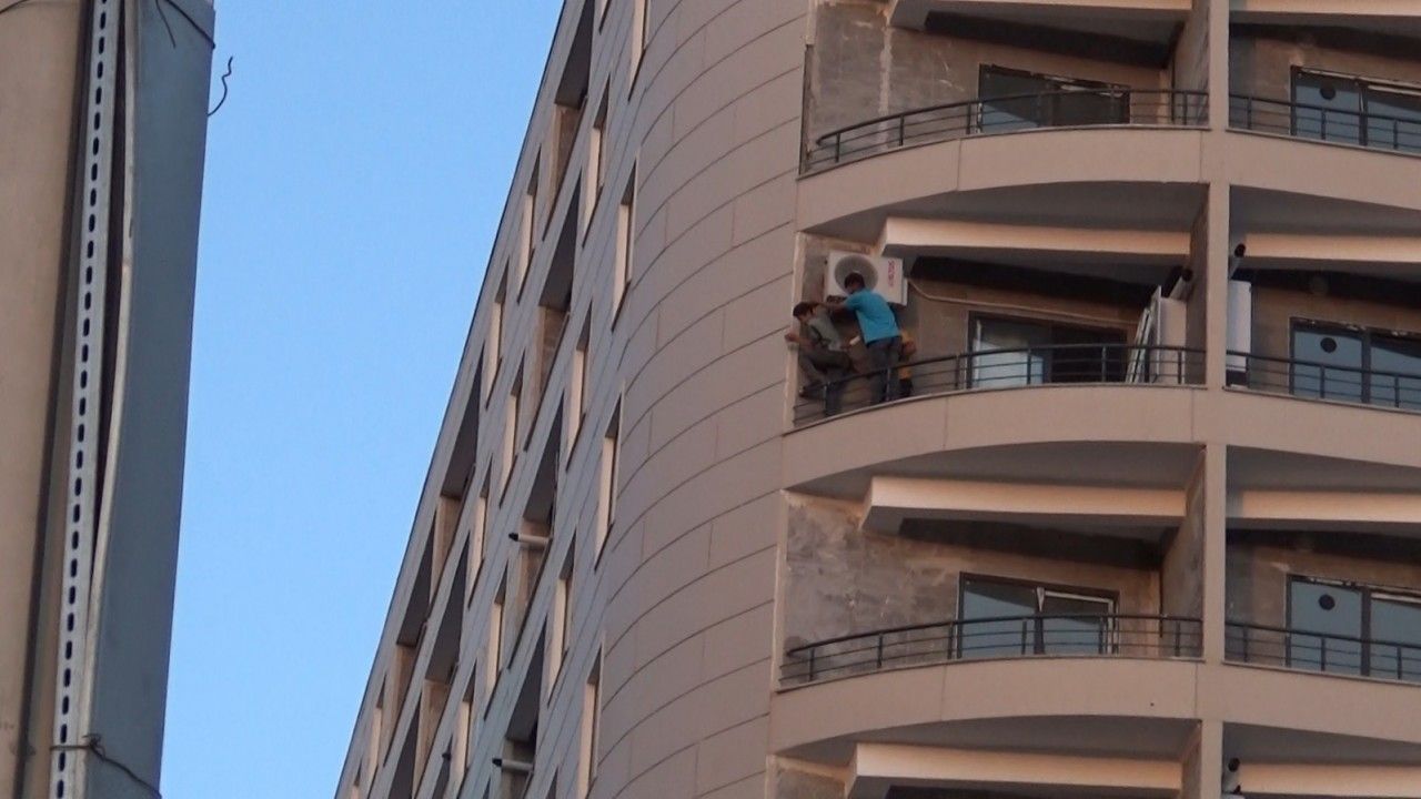 Şanlıurfa’da çocuk yaştaki 3 kişinin, 12 katlı bir binanın 8’inci katında hiçbir güvenlik önlemi olmadan klima montajı yaptığı anlar kameraya yansıdı.