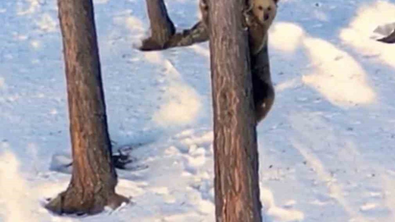 Görüntülerde, Kars’ın Sarıkamış ilçesinde sarıçam ağaçları arasında kış uykusundan uyanır uyanmaz devasa boz ayının ustalıkla ağacın gövdesine sarılarak hızla yukarı tırmandığı görüldü. Ayının hareketi vatandaşları gülümsetti.