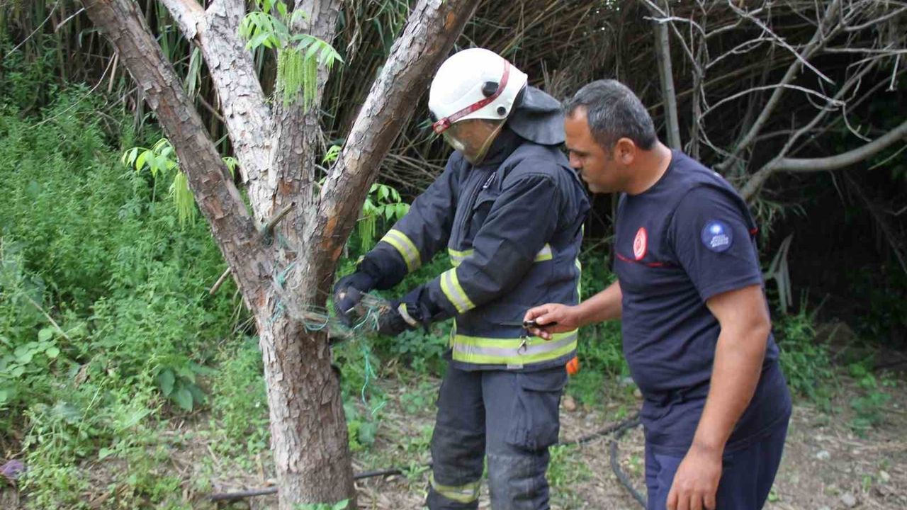 Serik’te bir evin bahçesinde balık ağlarına dolanan yılanı, itfaiye ekipleri bulunduğu yerden kurtararak doğal ortamına saldı.