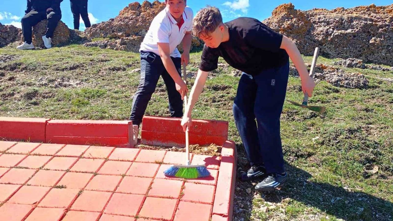 Müdür yardımcısı Ramazan Öğütel ve beden eğitimi öğretmeni Gürkan Çelik'in öncülüğünde gerçekleştirilen etkinlikte öğrenciler, fırçalarla bayrağın bulunduğu zemini titizlikle temizledi.