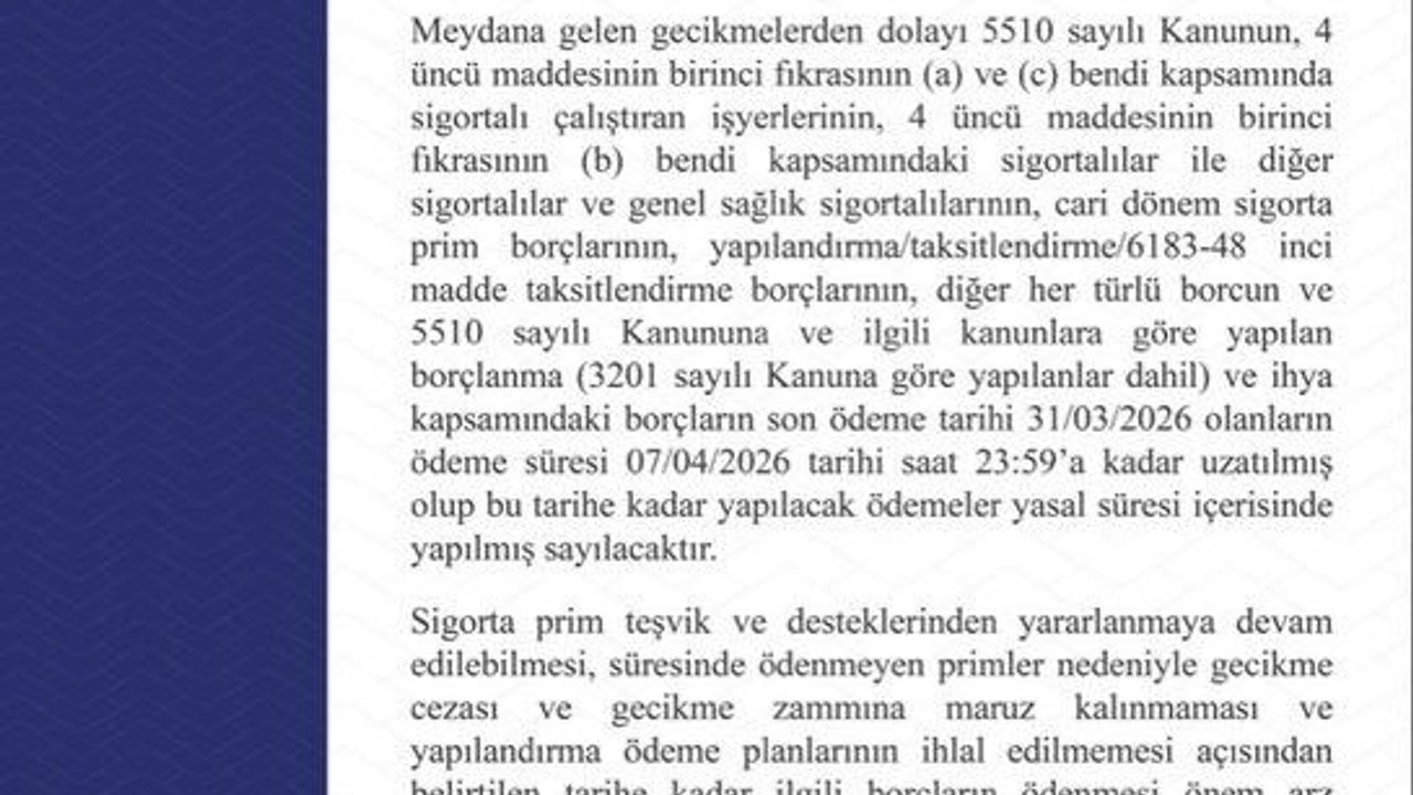 SGK tarafından yapılan açıklamada, 'Kurum muhasebe işlemlerinin yürütüldüğü Mali Otomasyon Sistemi (MOSIP) altyapısında yapılan güncelleme çalışmalarından dolayı bazı hizmetlere erişilmesinde gecikmeler meydana gelmiştir. Meydana gelen gecikmelerden dolayı 5510 sayılı Kanunun, 4 üncü maddesinin birinci fıkrasının (a) ve (c) bendi kapsamında sigortalı çalıştıran işyerlerinin, 4 üncü maddesinin birinci fikrasının (b) bendi kapsamındaki sigortalılar ile diğer sigortalılar ve genel sağlık sigortalılarının, cari dönem sigorta prim borçlarının, yapılandırma/taksitlendirme/6183-48 inci madde taksitlendirme borçlarının, diğer her türlü borcun ve 5510 sayılı Kanununa ve ilgili kanunlara göre yapılan borçlanma (3201 sayılı Kanuna göre yapılanlar dahil) ve ihya kapsamındaki borçların son ödeme tarihi 31/03/2026 olanların ödeme süresi 7 Nisan 2026 tarihi saat 23:59'a kadar uzatılmış olup bu tarihe kadar yapılacak ödemeler yasal süresi içerisinde yapılmış sayılacaktır. Sigorta prim teşvik ve desteklerinden yararlanmaya devam edilebilmesi, süresinde ödenmeyen primler nedeniyle gecikme cezası ve gecikme zammına maruz kalınmaması ve yapılandırma ödeme planlarının ihlal edilmemesi açısından belirtilen tarihe kadar ilgili borçların ödenmesi önem arz etmektedir' denildi.